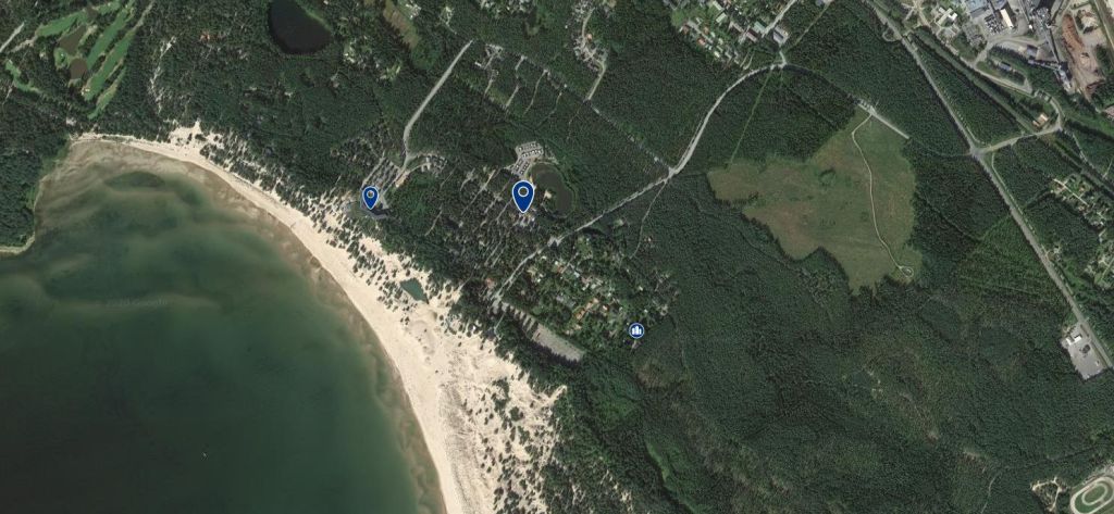 One option is to check where Yyteri Kylpylä address takes you (the upper spot om map), but a better place is positioning your car map til the Yyteri camping site (Yyterinsantojentie 1, 28840 Yyteri) and passing it until there is a parking place at the end of street.